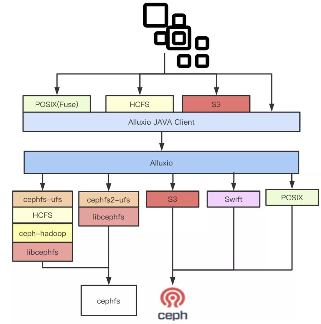 在大数据生态系统中,Alluxio 位于数据驱动框架或应用和各种持久化存储系统之间。Alluxio 统一了存储在这些不同存储系统中的数据,为其上层数据驱动型应用提供统一的客户端 API 和全局命名空间。在我们的场景中,底层存储是 cephfs, 应用是特征计算,将 Alluxio 作为中间层提供分布式共享缓存服务,非常适合对特征计算业务这种一写多读,小文件高并发访问场景进行优化, 主要体现在几个方面: