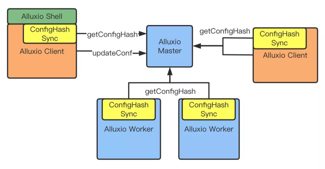 如上图所示,在 Client 和 Master 之间,增加了 updateConf API,通过该 API,可以向 Alluxio Master 发送配置的变更请求,master 把配置更新后,其内部的 config hash 也会变化。其它 client、worker 等与 Alluxio Master 连接的服务会周期性与master 同步config hash,也会感知到配置变化,从而同步变化的配置。
