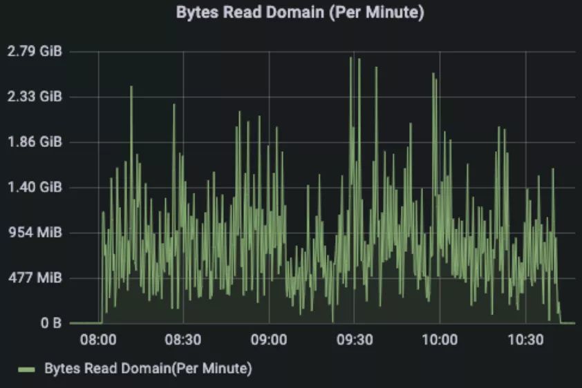 通过 Read Remote, Read UFS, Read Domain 指标观察数据的本地性,可以看到,Remote Read 和 Read Domain 占主要部分, 大部分读流量是 worker 之间的远程读以及本地domain socket读,从 UFS 读的情况非常少。
