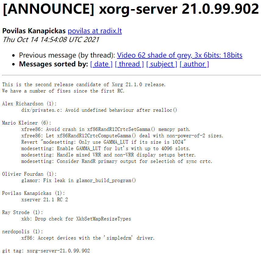 X.Org Server 的大版本更新终于有了进展,其邮件列表显示,X.Org Server 21.1 第二个 RC 版本已发布。X.Org Server 21.1 即原计划的 1.21,这是近三年来的重要更新——上一个大版本是 2018 年 5 月发布的 X.Org Server 1.20。