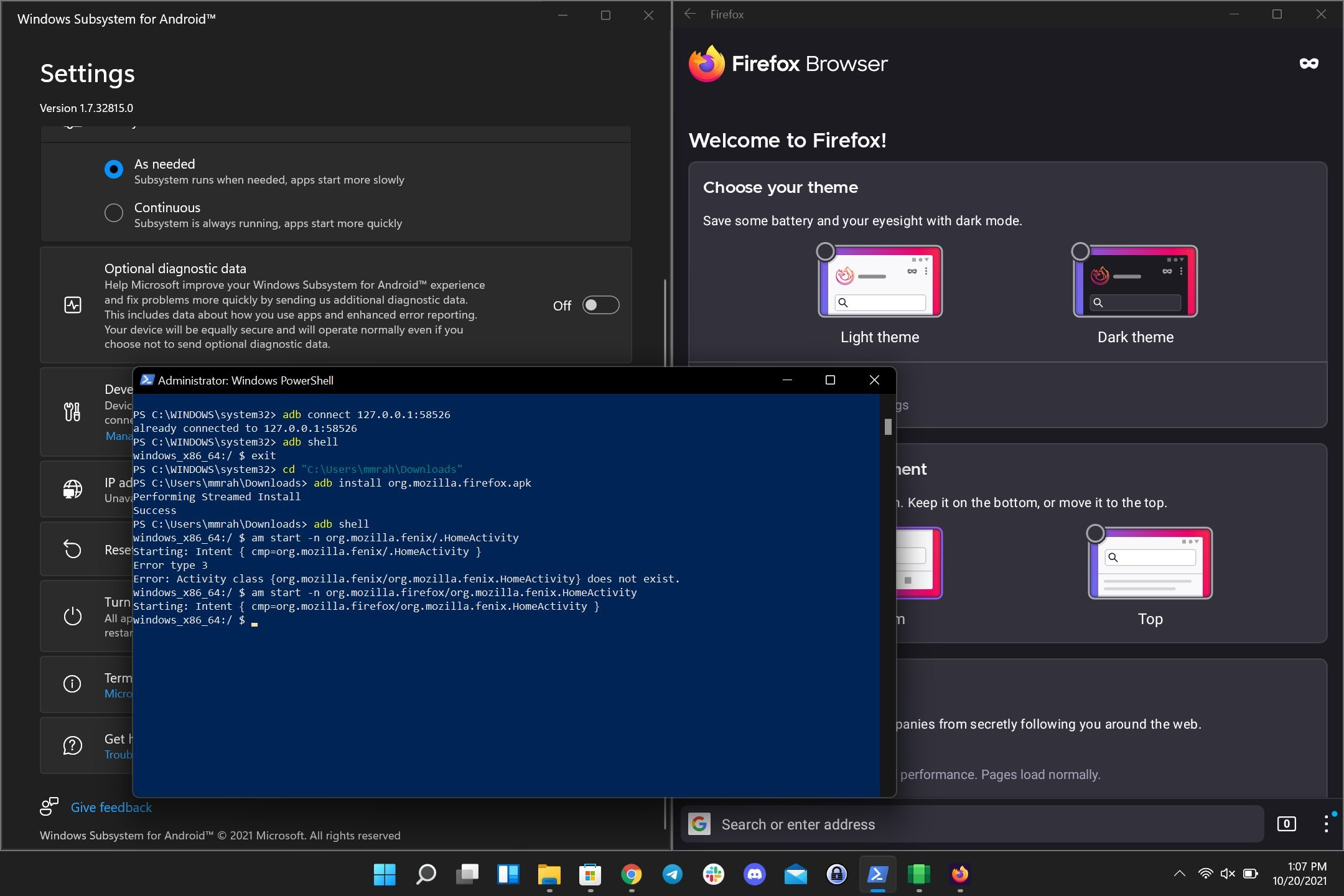 Windows 11 引入了一个名为 Windows Subsystem for Android 的新子系统,为 Amazon Appstore 及其目录提供支持。该子系统包括 Linux 内核和基于 AOSP 11 的 Android 操作系统,支持在 Hyper-V 虚拟机中运行,就像 Windows 的 Linux 子系统,可以将 AOSP 环境中 App 的运行时和 API 映射到 Windows 图形层、内存缓冲区、输入模式、物理和虚拟设备以及传感器,支持在英特尔、AMD、高通的 CPU 上运行,支持使用 ADB 直接安装 APK 安装包。
