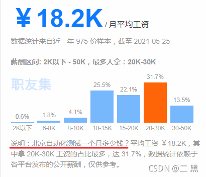 基于企业的需求,一线城市自动化测试的平均薪资基本在18K/月左右,未来自动化测试会是作为测试人员主流方向,对于技术的追求程度及全面性会越来越高。所以具备自动化测试的技能显得尤为重要。