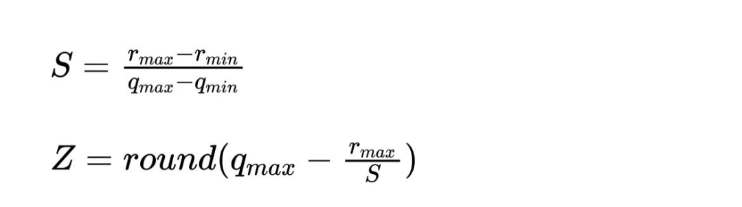 这里简单总结一下,无论是TFLite的量化方案还是TensorRT的后量化方案,他们都会基于原始数据和量化数据的数值范围算出一个缩放系数scale和零点zero_point,这个zero_point有可能是0(对应对称量化),也有可能不是0(对应非对称量化)。然后原始数据缩放之后减掉零点就获得了量化后的数据。这里的关键就在于缩放系数scale和zero_point怎么求,Google的TFLite使用下面的公式: