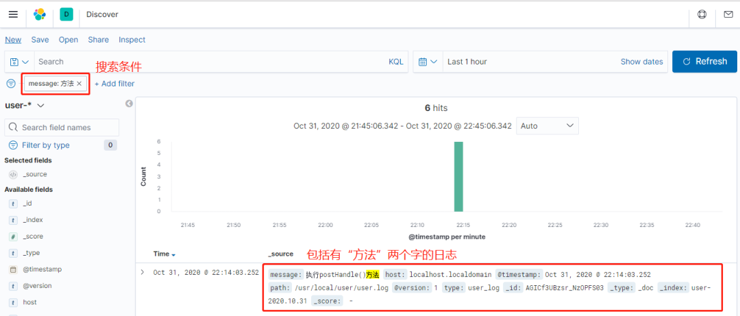 最后,就可以到Discover栏进行选择,选择user-*的Index Pattern,然后搜索关键字,就找到相关的日志了!