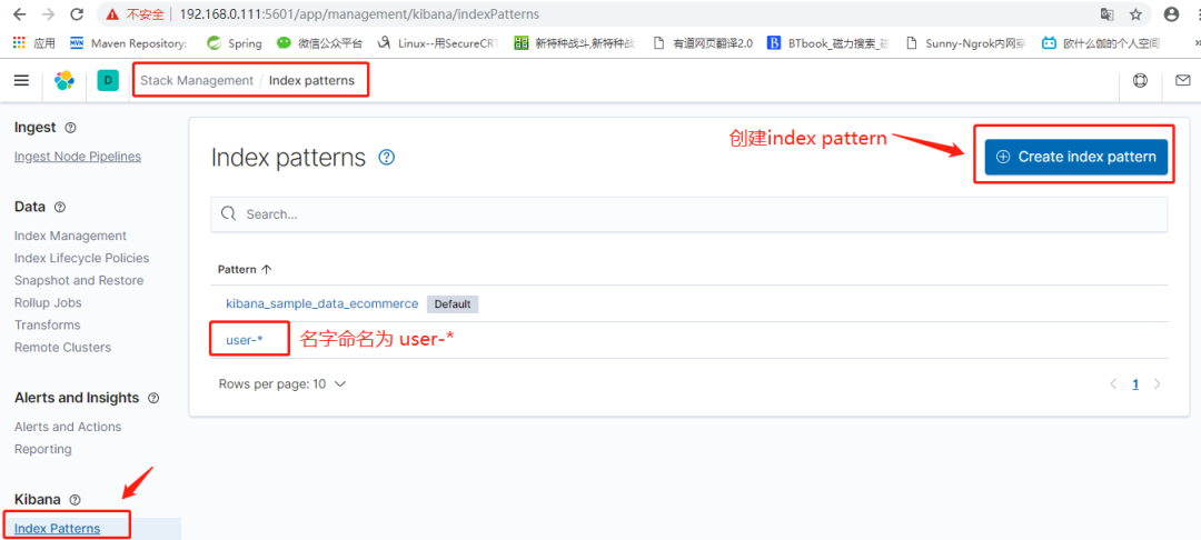 点击Index Patterns菜单栏,然后创建,命名为user-*。