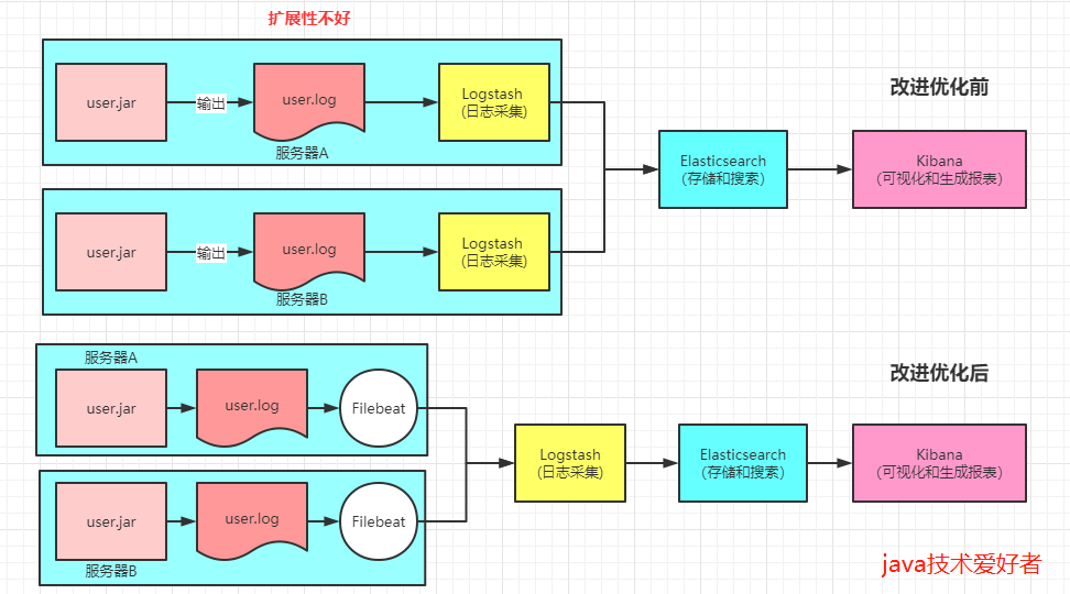 上面只是用到了核心的三个组件简单搭建的ELK,实际上是有缺陷的。如果Logstash需要添加插件,那就全部服务器的Logstash都要添加插件,扩展性差。所以就有了FileBeat,占用资源少,只负责采集日志,不做其他的事情,这样就轻量级,把Logstash抽出来,做一些滤处理之类的工作。