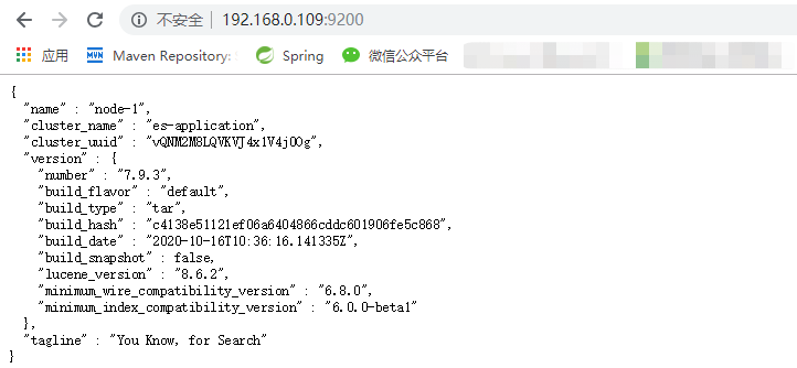 访问http://192.168.0.109:9200/可以看到如下信息,表示安装成功。