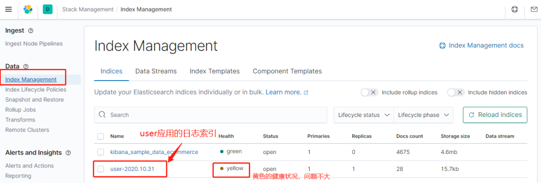 浏览器打开http://192.168.0.111:5601,到管理界面,点击“Index Management”可以看到,有一个user-2020.10.31的索引。