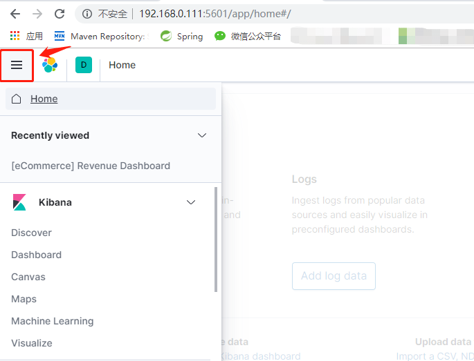 启动后在浏览器打开http://192.168.0.111:5601,可以看到kibana的web交互界面: