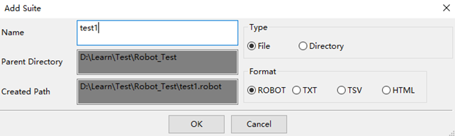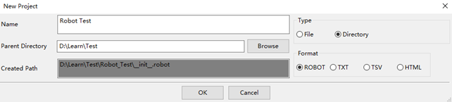 启动Robot Framework后,点击“File-->New Project”,编辑测试项目,类型选择“Directory”,Format选择“ROBOT”,如下所示: