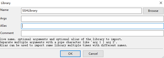 在弹出的窗口中“Name”中,输入“SSHLibrary”,需要注意的是“字母大小写必须如图中所示”,然后点击确定,即可导入SSHLibrary组件库。