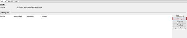 导入SSHLibrary组件库,选中所创建的测试计划名称,在右侧的“Edit”标签下,点击右侧的“Add Import”下的“Library”按键,如下所示的位置: