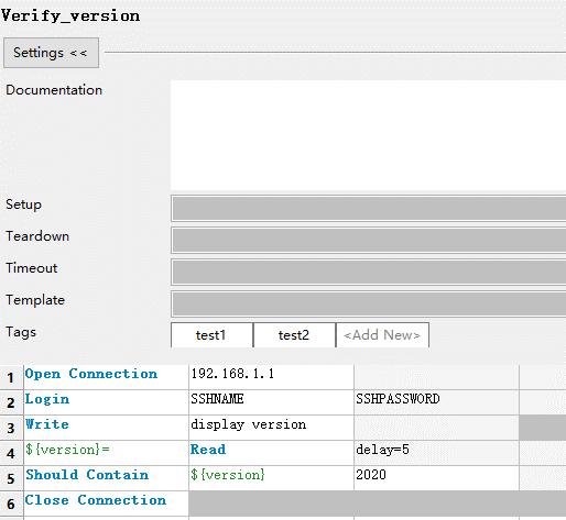其中的表格部分,是我们需要填入的内容,详细信息可以参考我的SSHLibrary理解性翻译 https://gitee.com/rustfree/fl-2-zh/blob/master/工具指导/202105-RobotFramework-SSHLibrary/SSHLibrary理解.md