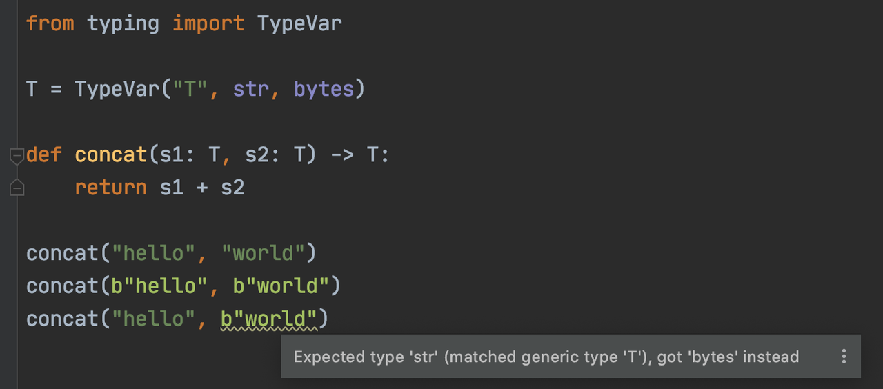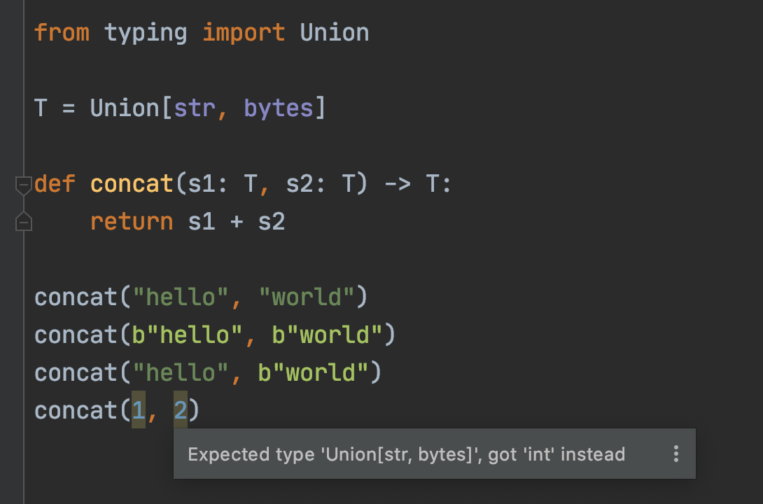 如果不想使用泛型,只想使用几种指定的类型,那么可以使用 Union 来做。比如定义 concat 函数只想接收 str 或 bytes 类型。