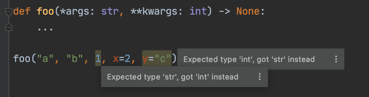 def foo(*args: str, **kwargs: int) -> None: