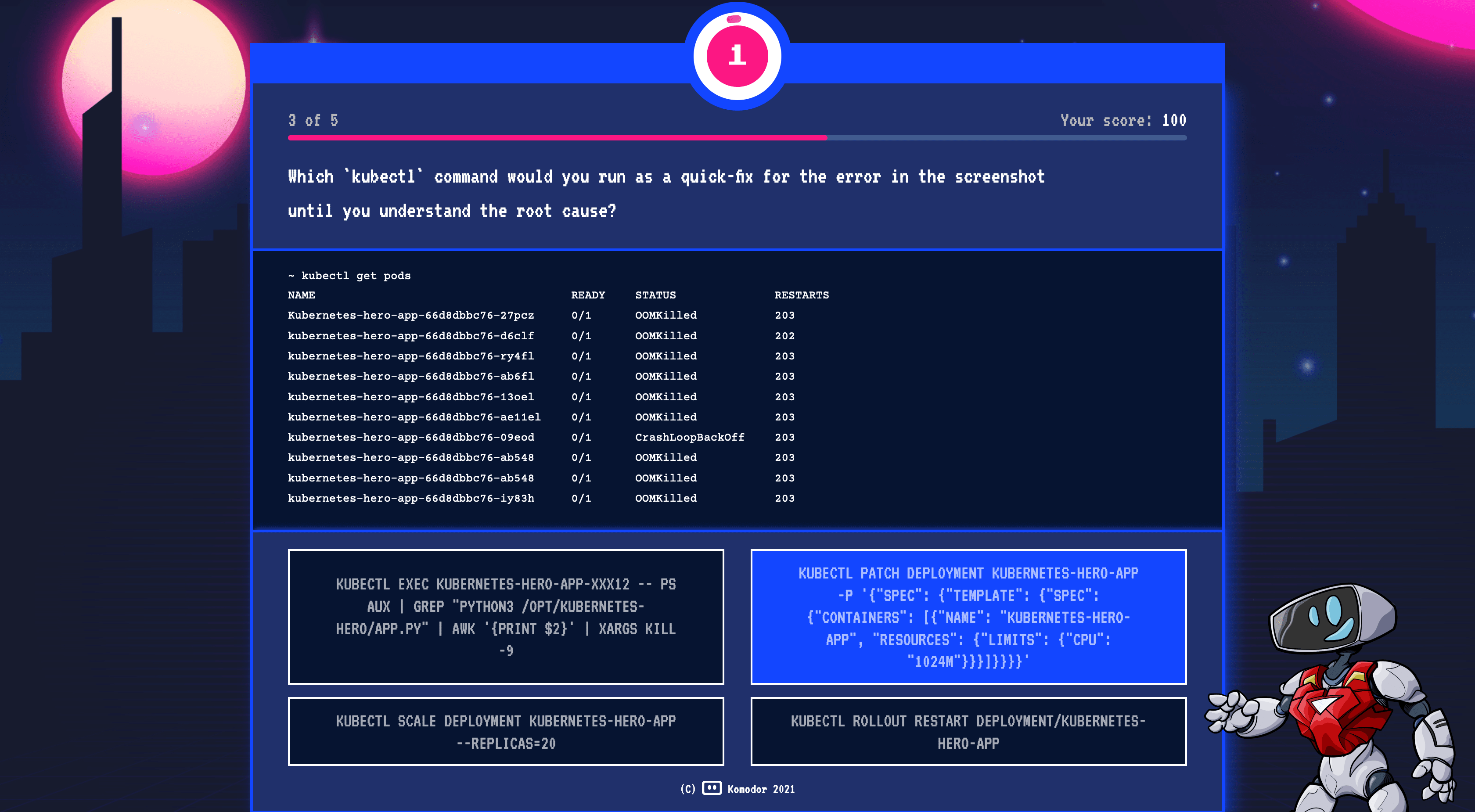 K8s On-Call Hero 是一款很酷的游戏,可以在其中测试和提高解决问题的能力。游戏的设计类似于限时有奖竞答,在限定的时间内答对一题得 100 分。前 50 名玩家都将获得一件特别订制的 Komodor KubeCon T 恤,同时还会通过抽奖从前 50 名玩家中抽取一位玩家送出一张价值 $2,500 的机票。