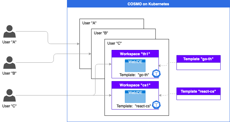 COSMO 是一个轻量级 WebIDE 管理平台,可以部署在 Kubernetes 集群中。它可以通过模板来创建不同的 IDE 容器,比如 code-server,另外还提供了统一的身份认证功能。