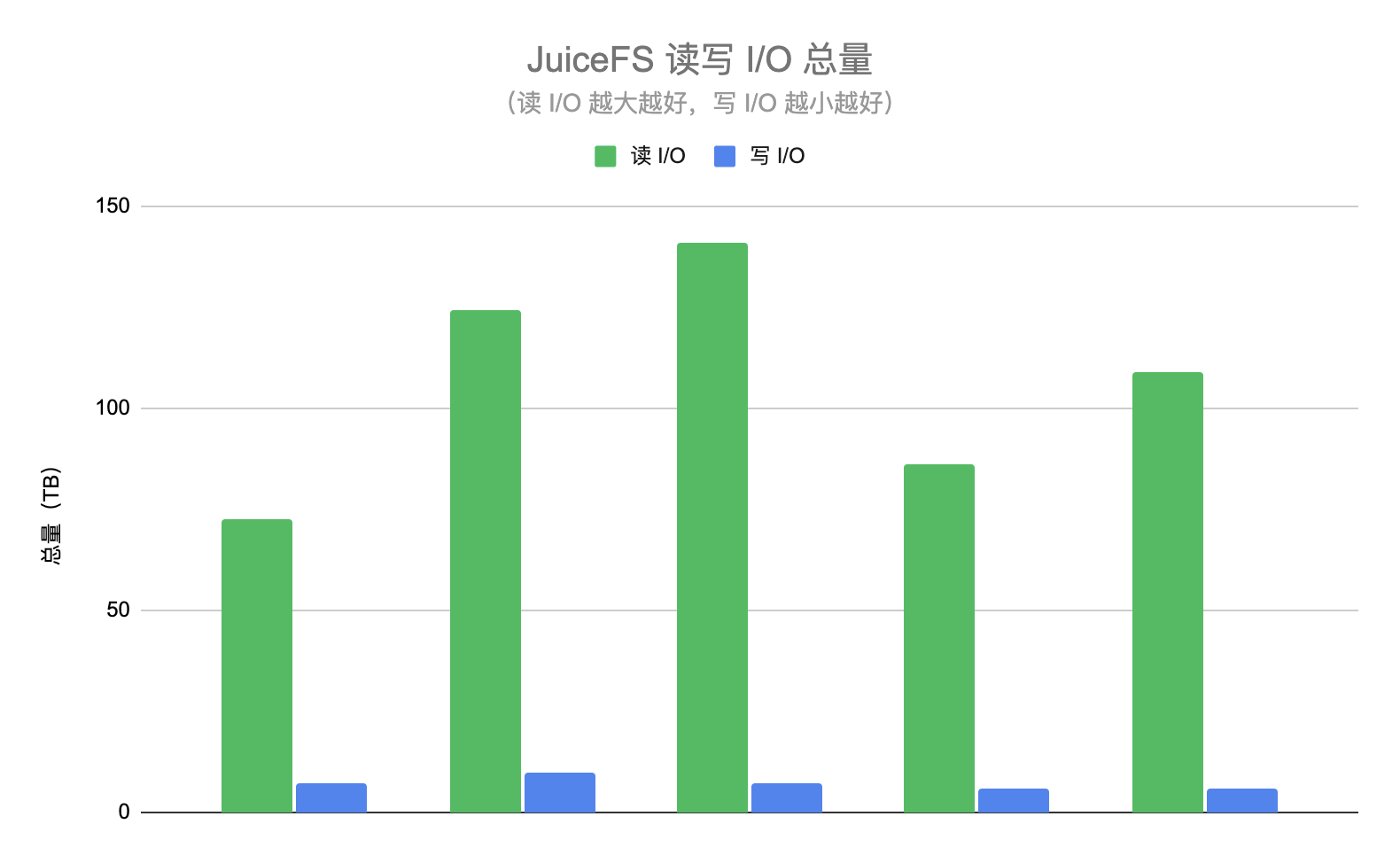 从另一个维度也能反映 HDFS 集群负载降低的效果,在这两个阶段我们都统计了读取及写入 JuiceFS 的 I/O 总量。JuiceFS 的读 I/O 表示为 HDFS 集群降低的 I/O 量,如果没有使用 JuiceFS 那么这些请求将会直接查询 HDFS。JuiceFS 的写 I/O 表示从 HDFS 拷贝的数据量,这些请求会增大 HDFS 的压力。读 I/O 总量应该越大越好,而写 I/O 总量越小越好。下图展示了某几天的读写 I/O 总量,可以看到读 I/O 基本是写 I/O 的 10 倍以上,也就是说 JuiceFS 数据的命中率在 90% 以上,即超过 90% 的 ad-hoc 查询都不需要请求 HDFS。