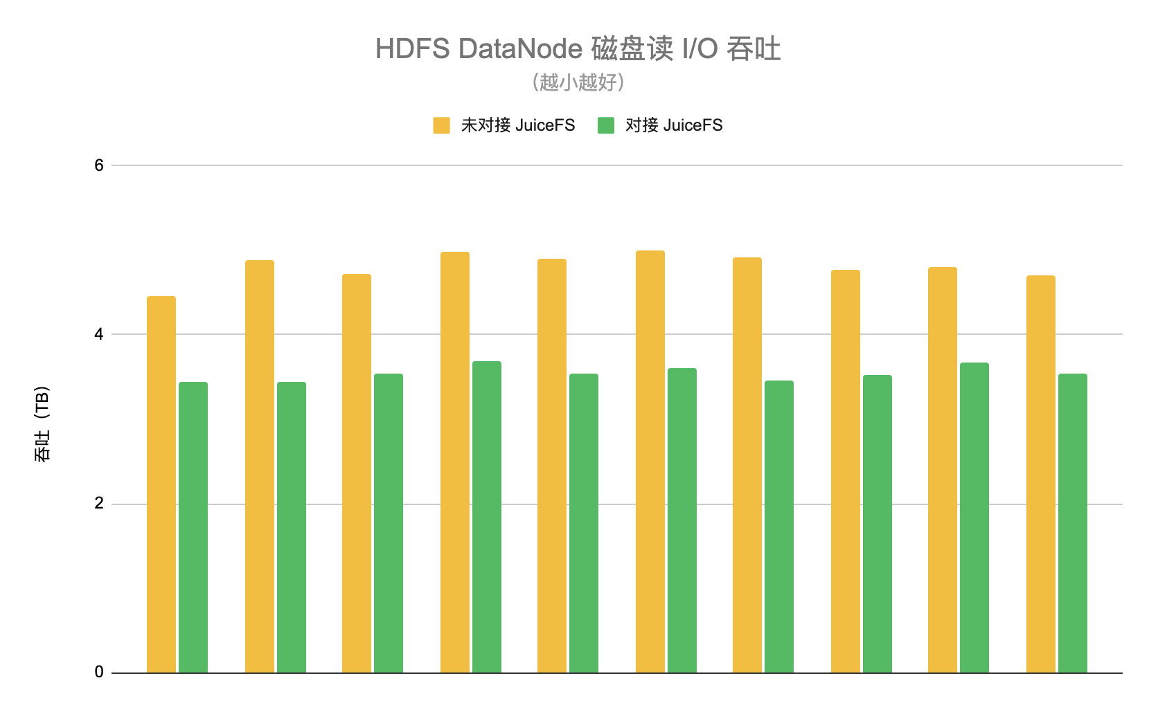 我们设计了两个阶段分别开启和关闭 JuiceFS 的功能。在开启阶段随机选取 10 台 HDFS DataNode,统计这一阶段每台 DataNode 平均每天的磁盘读 I/O 吞吐,平均值约为 3.5TB。在关闭阶段同样选择这 10 个节点,统计下来的平均值约为 4.8TB。因此使用 JuiceFS 以后可以降低 HDFS 集群约 26% 的负载,如下图所示。
