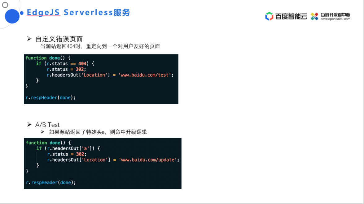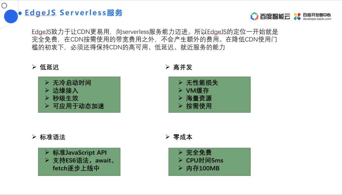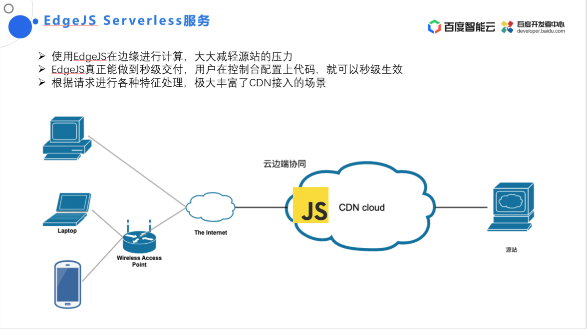 为此,我们推出了 EdgeJS Serverless 服务。该服务在百度智能云 CDN 上使用JavaScript 语言去提供的一种可编程的配置能力,实现高并发、低成本的敏捷交付,使 CDN 能够体现出 serverless 的思想,进行靠拢或者是计划。