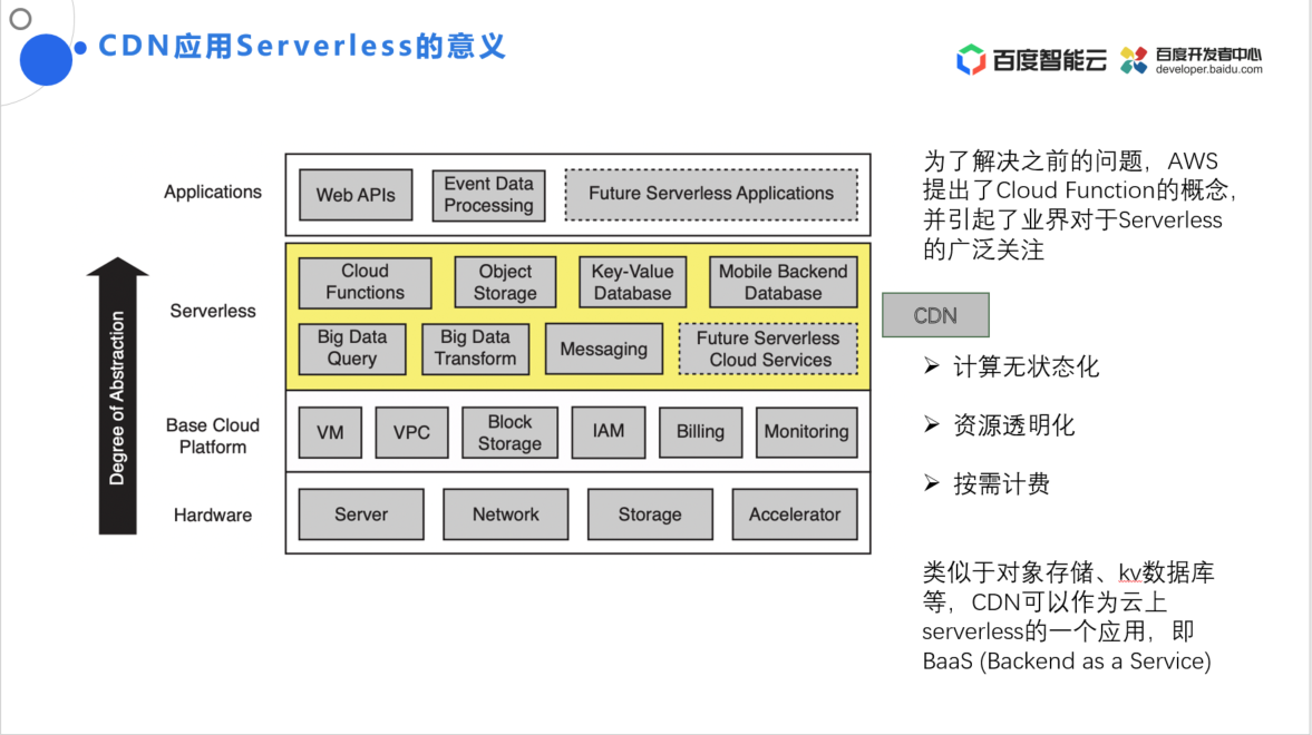 本文由百度智能云-视频云-内容分发加速技术架构师——高岩 在百度开发者沙龙线上分享的演讲内容整理而成。内容从CDN应用Serverless的意义出发,详细介绍EdgeJS Serverless服务。