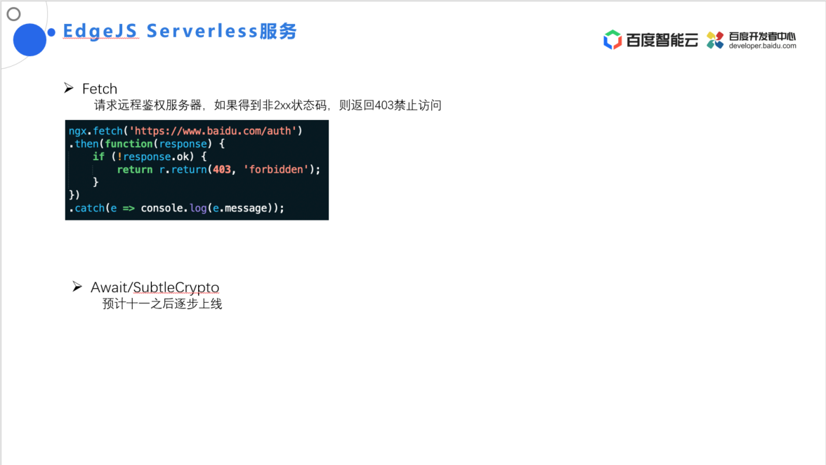 我们可以通过 EdgeJS Serverless 服务实现 Fetch 功能,请求远程鉴权服务器,根据远程服务器的响应进行处理,如果得到非 2xx 状态码,则返回 403 禁止访问。Fetch 返回的是一个 Promise 对象,包含类方法,可以将异步的操作变为序列化的操作,只要需要关心业务逻辑。与 Fetch 一同上线的还有 Await、SubtleCrypto 等功能。