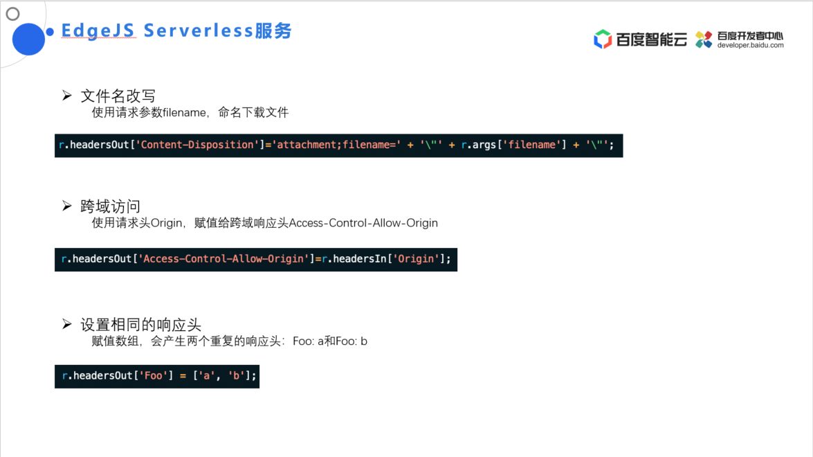EdgeJS Serverless 服务通过请求的 headersOut 特性可以实现文件名改写、跨域访问、设置相同的响应头等功能。