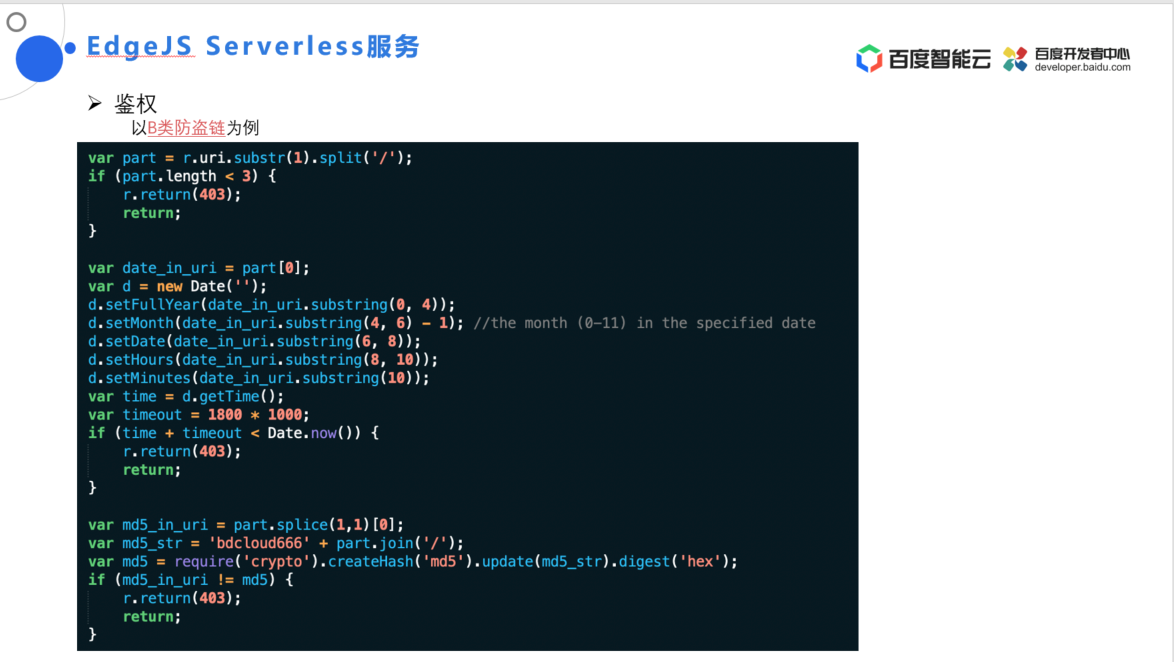 百度云基于 EdgeJS 提供了 B 类防盗链等鉴权功能。原始的 URL 包含协议头 HTTP、域名、文件名。在加密之后,URL 变成了协议头、域名、时间戳、MD5 编码,文件名。