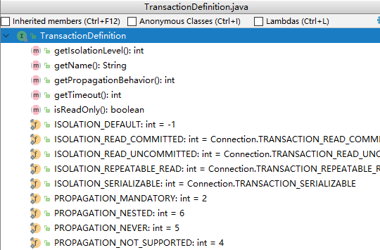 TransactionDefinition 用来描述事务的具体规则,也称作事务的属性。事务有哪些属性呢?看下图: