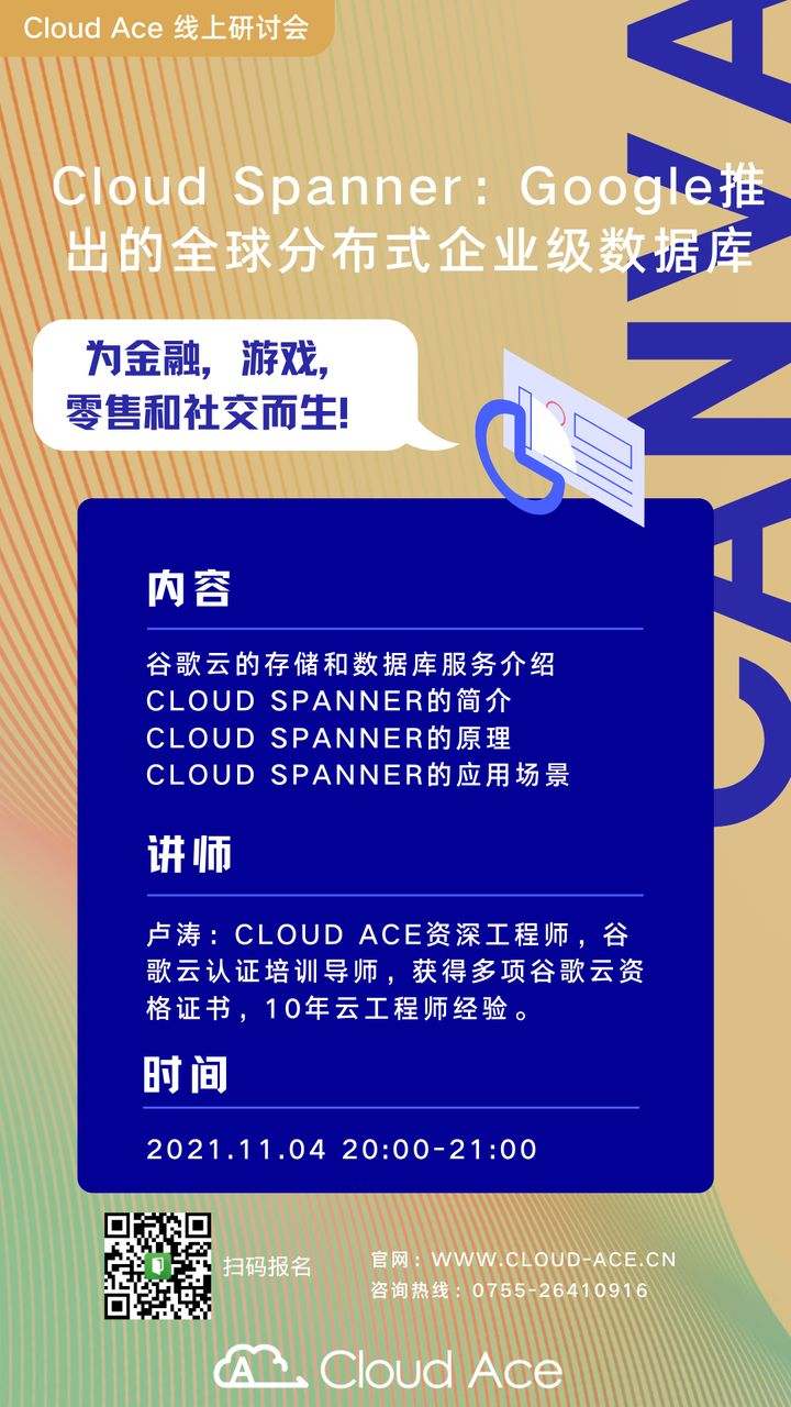 11月4日Cloud Ace工程师将分享关于谷歌推出的Cloud Spanner——全球分布且强一致性的企业级数据库服务,欢迎各位报名参加。