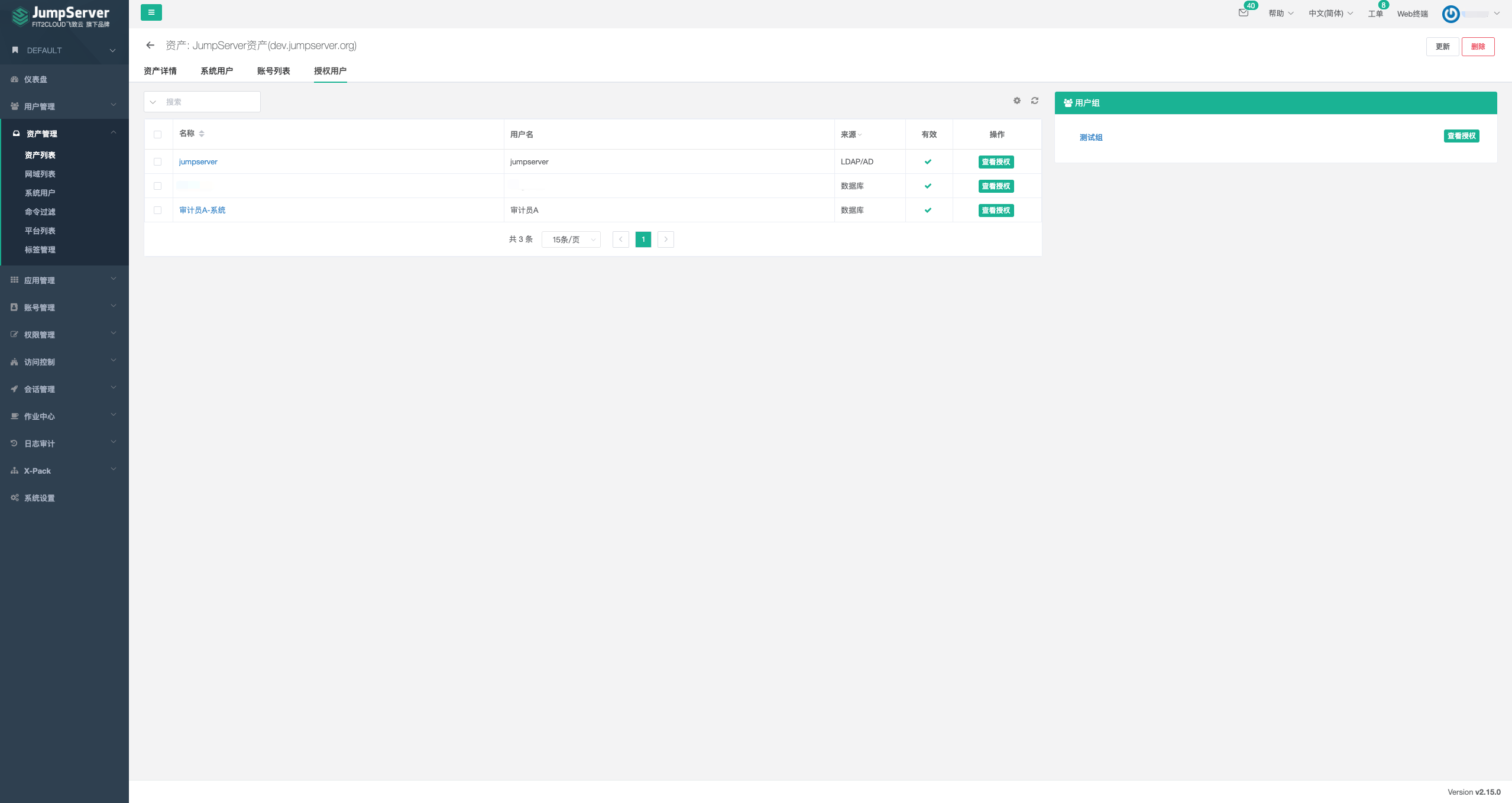 对于资产已经授权的用户、用户组,可以在新版本中的“资产详情”→“授权用户”页面中进行查看。点击“查看授权”按钮,可以看到当前用户、用户组和资产所关联的授权规则,方便管理员进行授权分配。