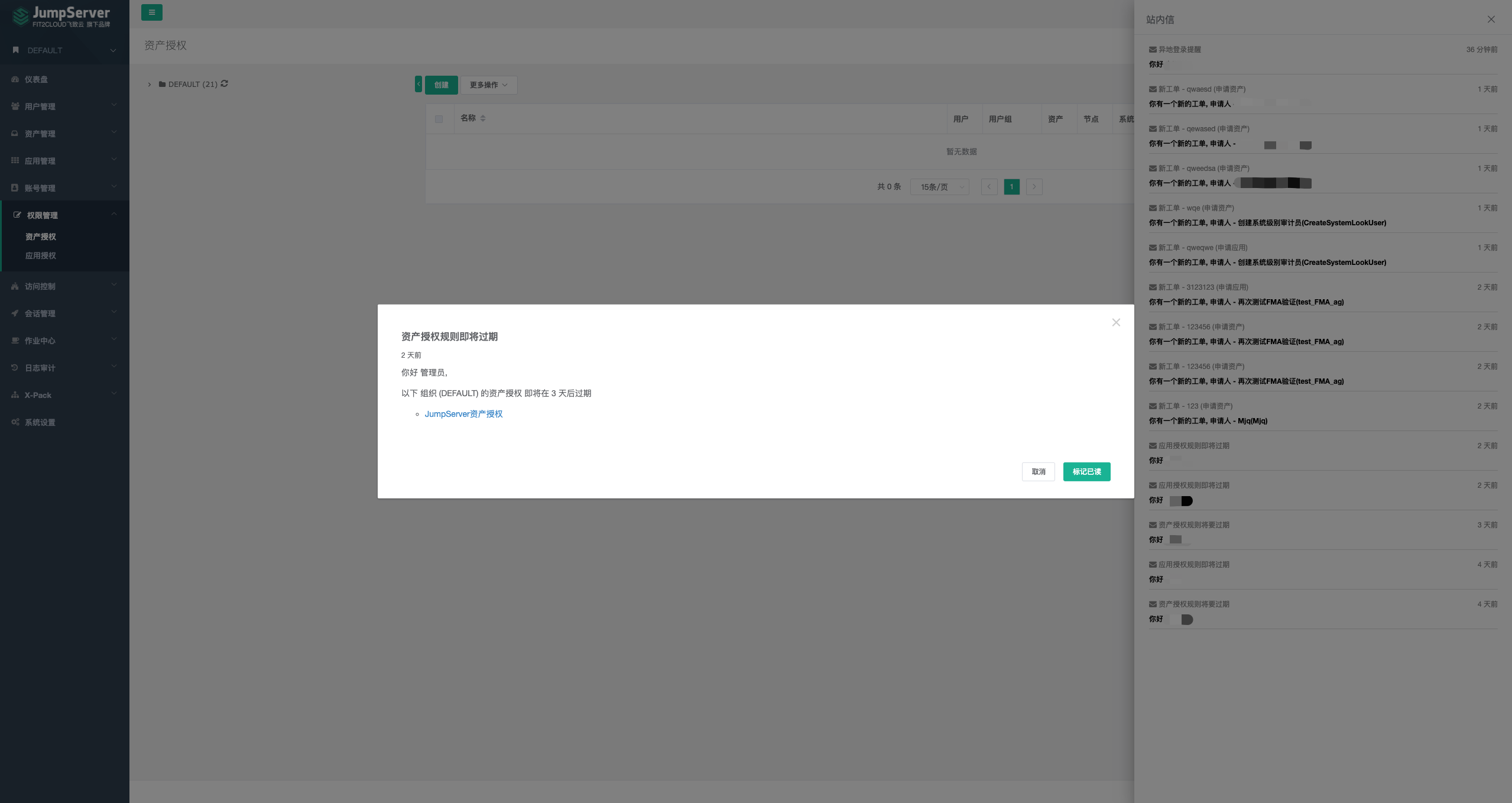 在JumpServer v2.15.0版本中,如果资产、应用等授权规则将在三天后过期,那么JumpServer会向组织管理员发送授权规则即将过期的消息。发送方式包括邮件、站内信、企业微信、钉钉、飞书等用户已经开启的消息接收服务,方便管理员及时针对不同的授权规则进行续期。