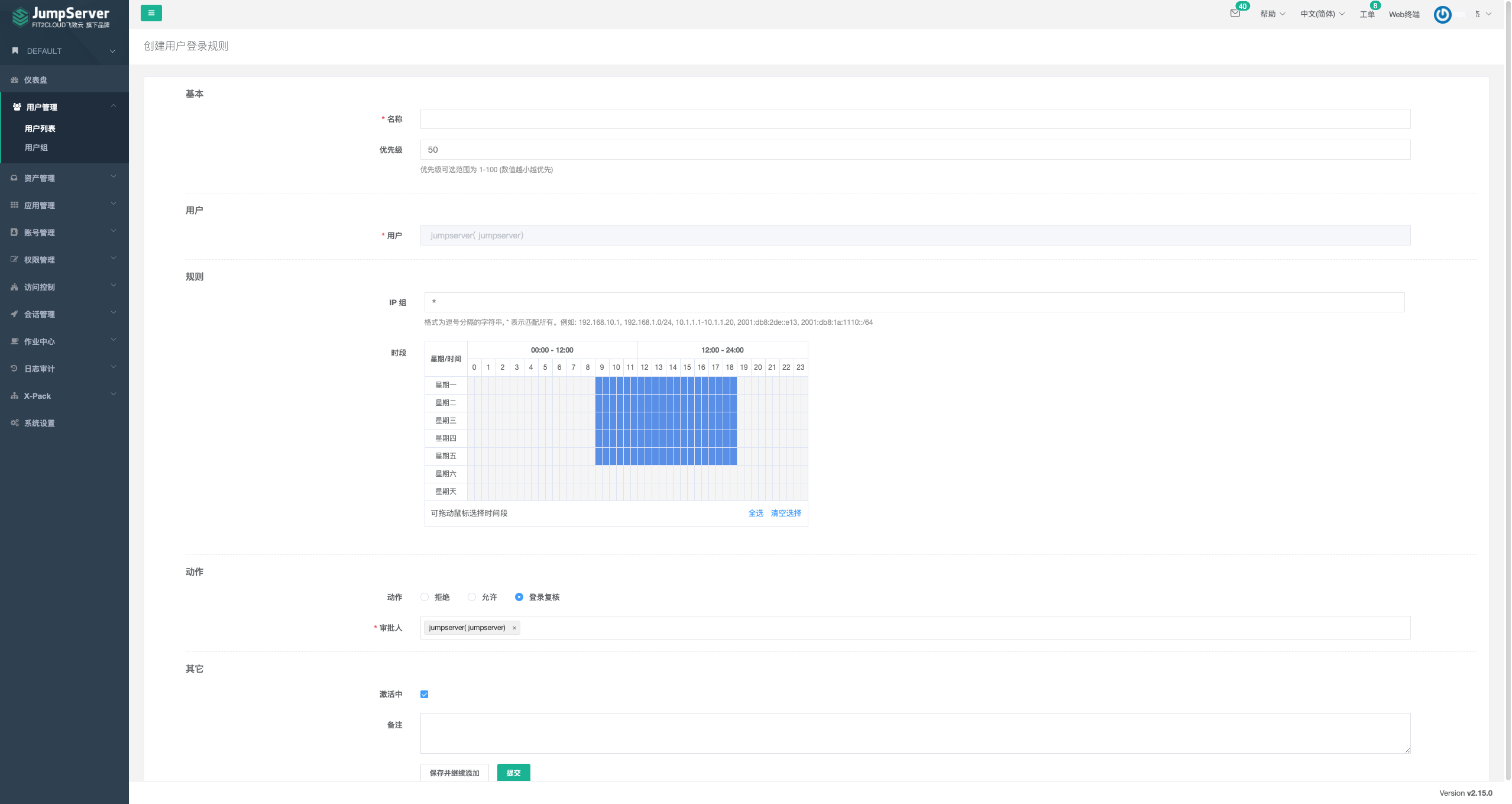 在JumpServer v2.15.0版本中,用户登录规则的条件除了IP限制以外,增加了对于登录时间段的限制,管理员可以控制用户登录JumpServer的具体时间段。