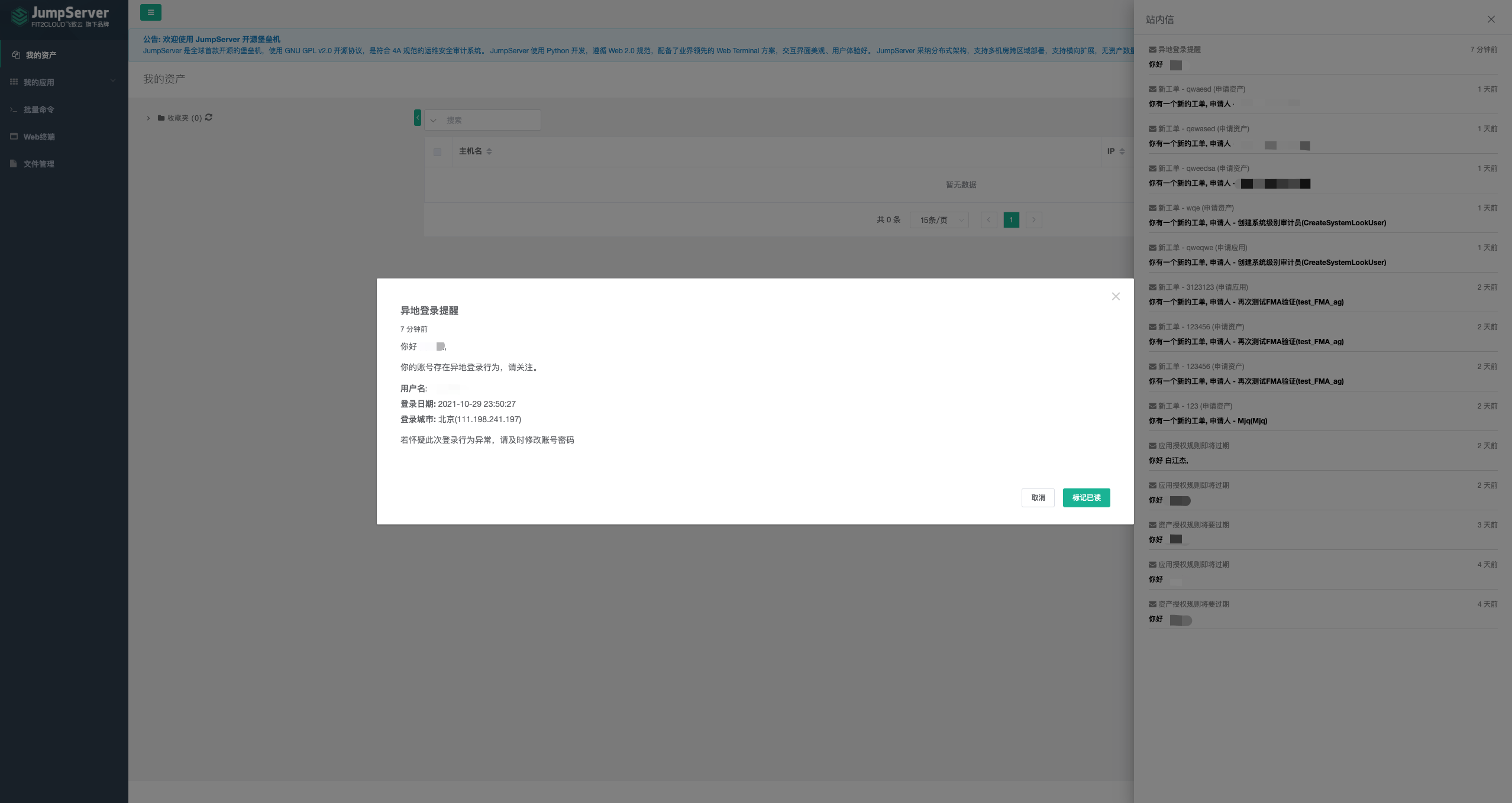 ▲图5 当用户异地登录JumpServer时,站内信中出现异地登录提醒