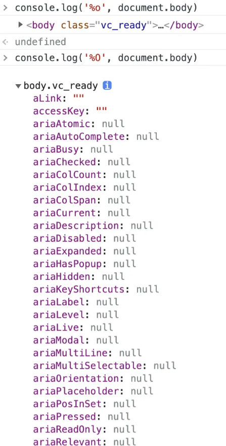 可以看到,使用 %o 打印的是DOM节点的内容,包含其子节点。而%O打印的是该DOM节点的对象属性,可以根据需求来选择性的打印。