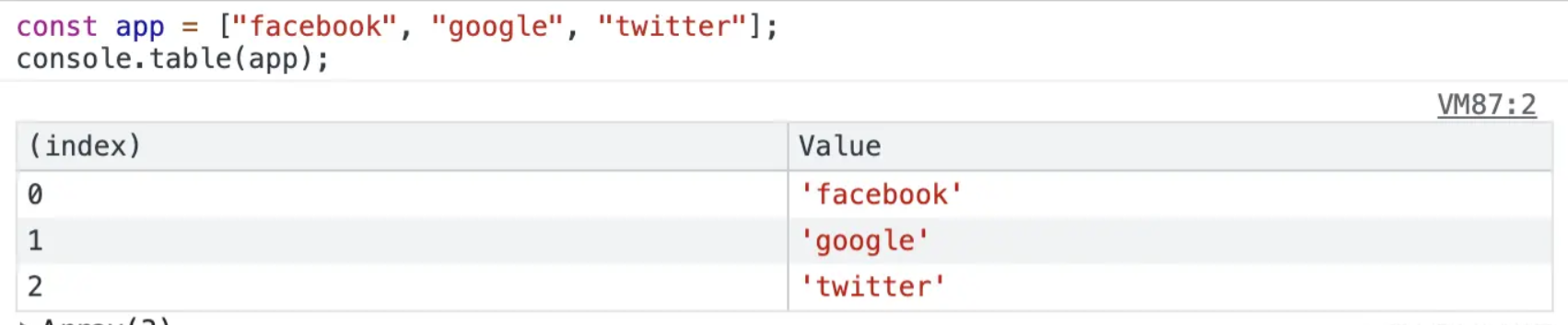 我们平时使用console.log较多,其实console对象还有很多属性可以使用,比如console.table(),使用它可以方便的打印数组对象的属性,打印结果是一个表格。console.table() 方法有两个参数,第一个参数是需要打印的对象,第二个参数是需要打印的表格的标题,这里就是数组对象的属性值。来看下面的例子: