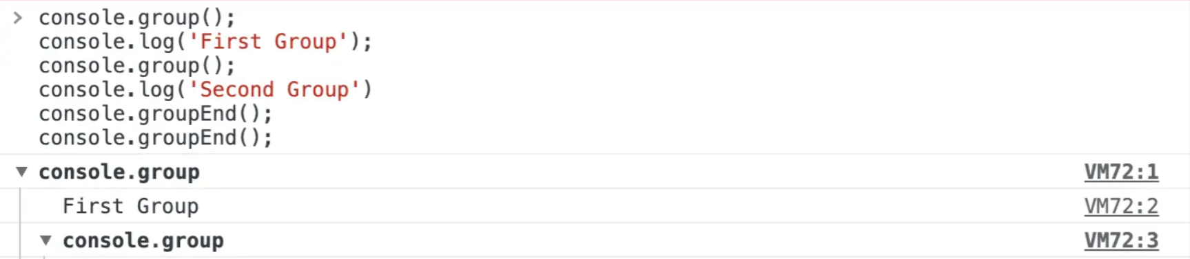 这两个方法用于在控制台创建一个信息分组。 一个完整的信息分组以 console.group() 开始,console.groupEnd() 结束。来看下面的例子: