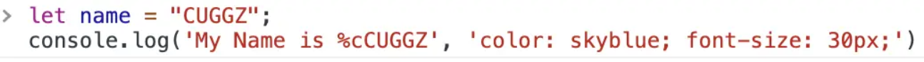 console.log('My Name is %cCUGGZ', 'color: skyblue; font-size: 30px;')