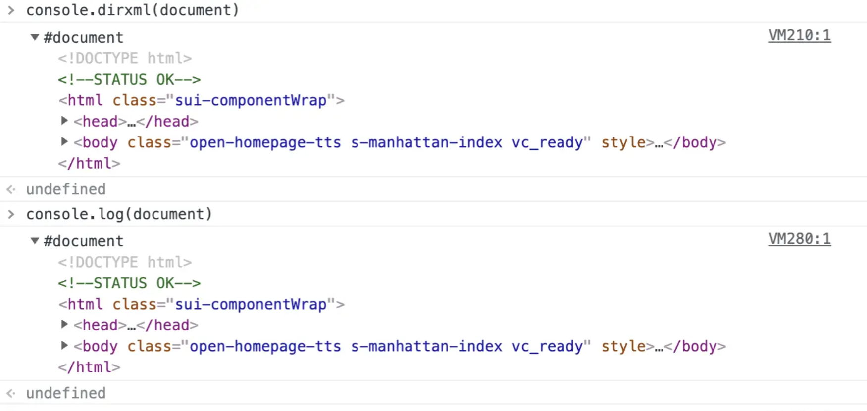 该方法会打印输出XML元素及其后代元素,对于XML和HTML元素调用console.log()和console.dirxml()是等价的。
