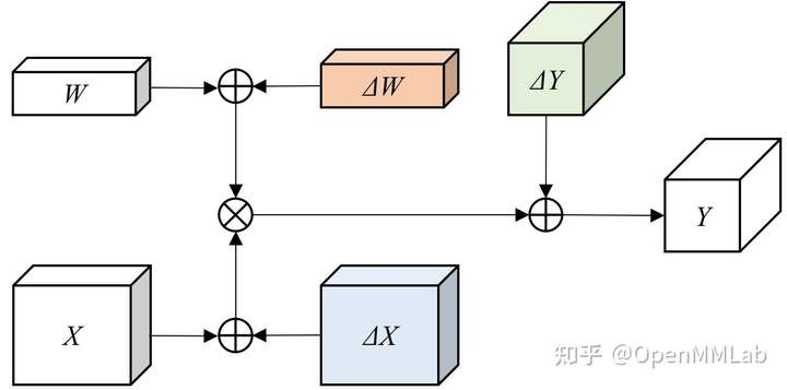实际部署过程中,为了获得更大的压缩率和更快的运行速度,或受限于部署平台的计算单元类型,模型通常需要对整个网络模型的权值和激活值均进行定点量化。为了简化讨论,我们以一层卷积作为示例,采用线性均匀量化的方法,并假设 bias 已经通过优化融合到了 conv 的 weight 中。如下图所示,整层网络的计算误差主要来自于三部分: