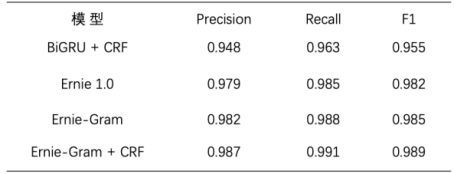 针对轻量化、高精度的需求,可以选用 RNN+CRF 方案。也可以采用预训练模型,通过模型压缩、动转静加速等方式满足精度和性能的要求。我们采用 Ernie-Gram[2] + CRF 获得了最佳效果。
