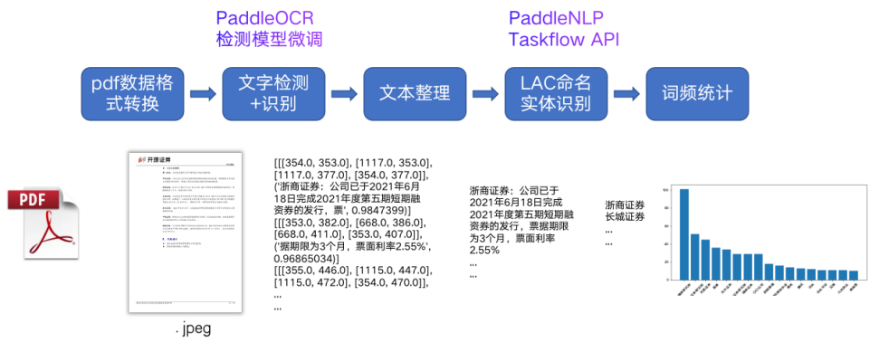 针对研报数据的命名实体识别与词频统计整体流程如上图所示。首先将研报 pdf 数据使用 fitz 包拆分为图像格式,然后利用 PaddleOCR 套件在研报数据集上微调 PP-OCR[1]的检测模型,使用现有的识别模型获得文本信息。PP-OCR 是 PaddleOCR 中由百度自研的明星模型系列,由文本检测、文本方向分类器与文本识别模块串联而成。