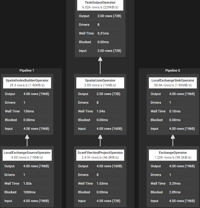 4) Spatial Join 执行SQL语句“select * from t1, t2 where ST_distance(ST_Point(t1.id, t1.value), ST_Point(t2.id, t2.value)) <= 10;”,join所在stage涉及算子如下图所示,其中完成join的算子是SpatialIndexBuilderOperator和SpatialJoinOperator。