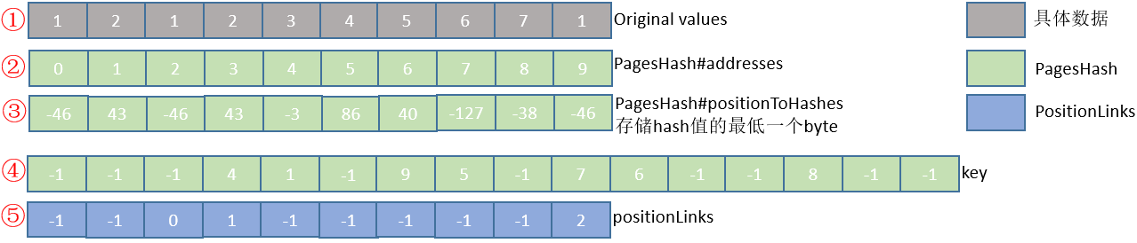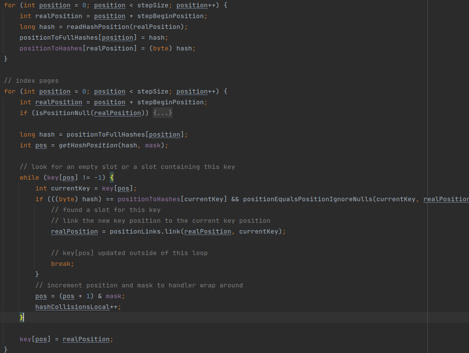 5) positionToHashes,byte数组,根据join key计算hash值,但是只保存低位的byte。PositionLinks处理的是,当hash值冲突且原始值也相同时,将满足这些情况的数据address使用数组链起来。核心代码片段如下: