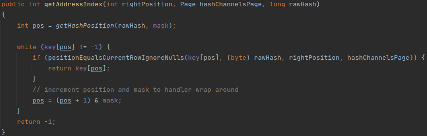 HashBuilderOperator构建完hash table后,LookupJoinOperator才能开始处理数据进行探测。而LookupJoinOperator使用hash table的核心代码片段如下: