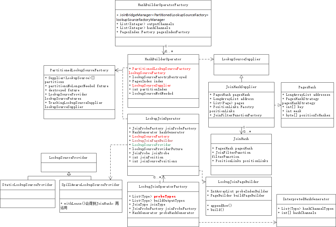 图2-2展示了Hash Join所涉及的类图,其中比较重要的类有以下几个: 1) HashBuilderOperatorFactory/HashBuilderOperator,针对build表构建Hash Table; 2) JoinHash,Hash Table承载类; 3) LookupJoinOperatorFactory/LookupJoinOperator,负责probe表逐行探测; 4) LookupJoinPageBuilder,负责构建输出page。