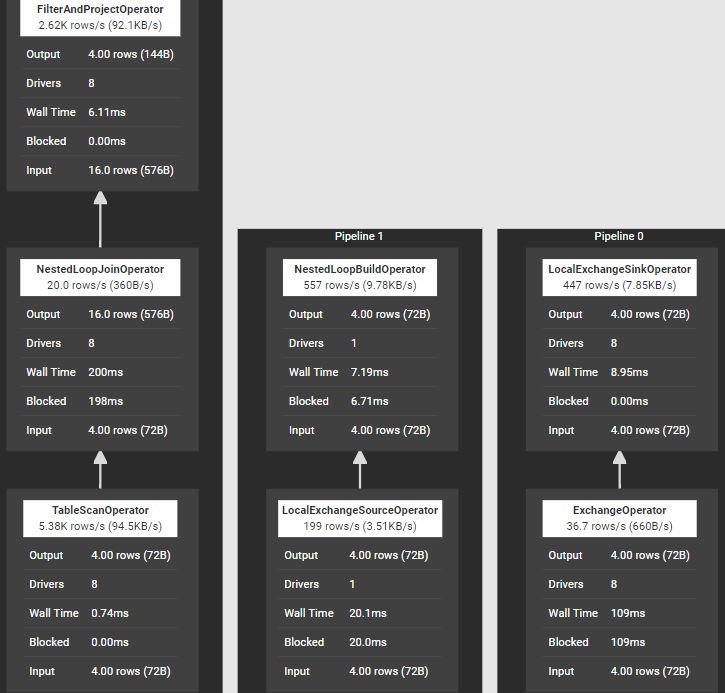 2) Nested Loop Join 执行SQL语句“select * from t1 join t2 on t1.value > t2.value;”,join所在stage涉及算子如下图所示,其中完成Join的算子是NestedLoopBuilderOperator和NestedLoopJoinOperator。