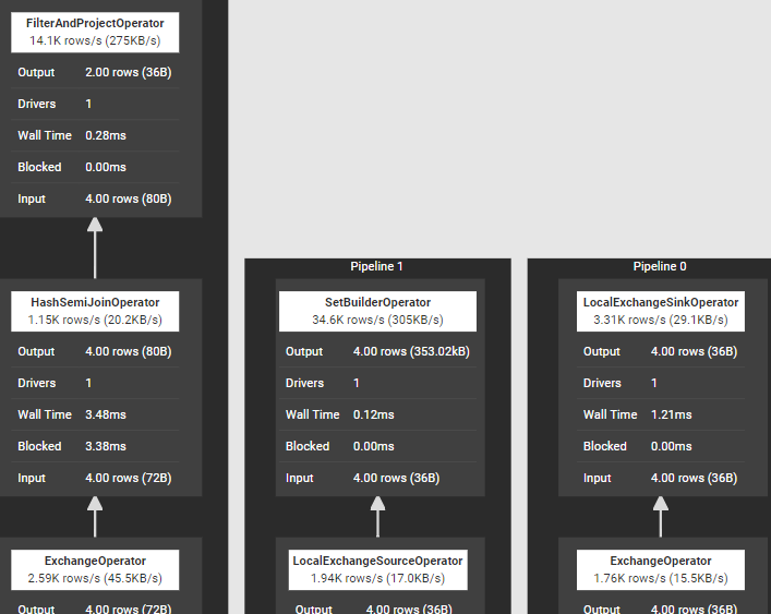 3) Hash Semi Join 执行SQL语句“select * from t1 where value in (select value from t2);”,join所在stage涉及算子如下图所示,其中完成join的算子是SetBuilderOperator和HashSemiJoinOperator。