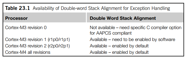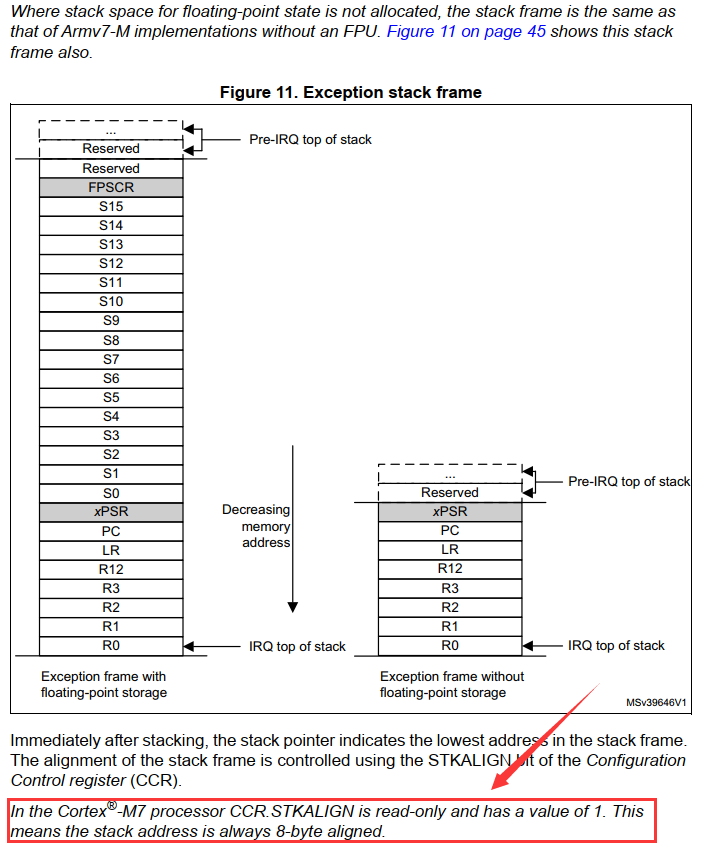 通过这两个图我们了解到:M0/M0+/M7的栈地址是固定8字节对齐,M3/M4的栈地址是对齐是可以通过SCB->CCR寄存器编程的为4字节或者8字节对齐。