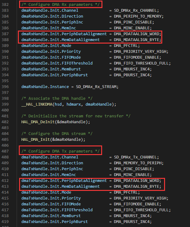 以STM32F4的DMA为例,我们的底层移植无需再单独开一个缓冲做4字节对齐,本质是F4 DMA支持了源地址和目的地址的数据宽度可以不同,但是数据地址必须要跟其数据类型对齐。